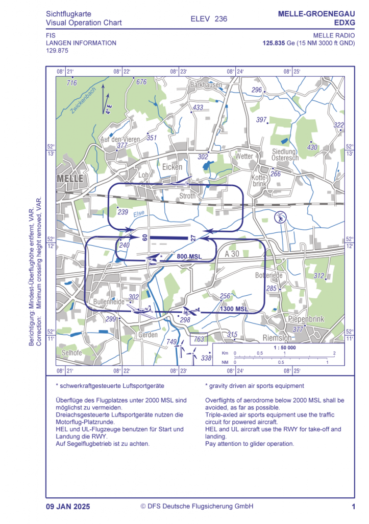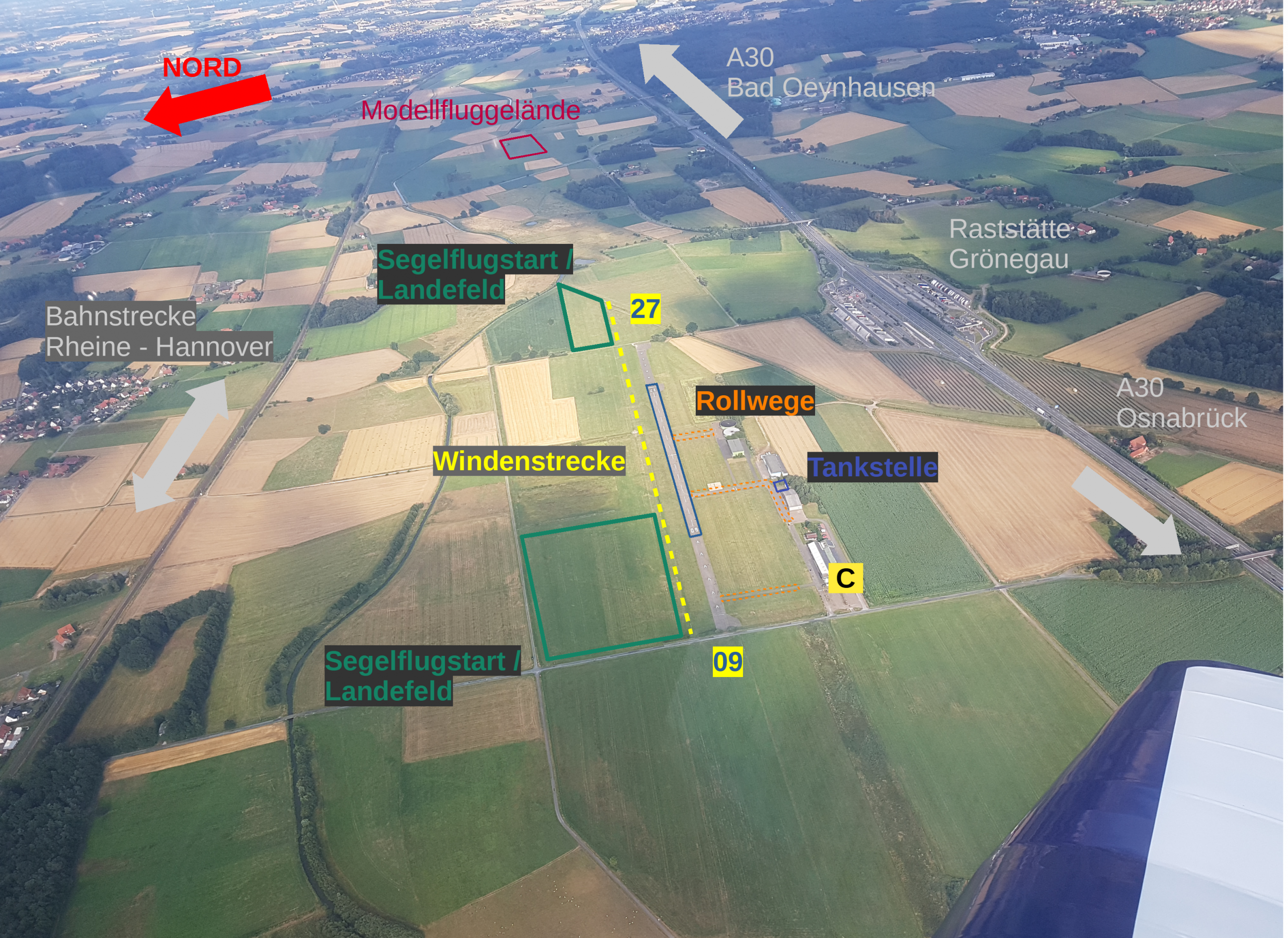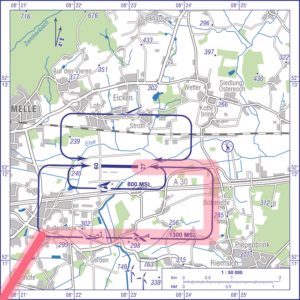 - Windkraftanlage direkt S des Gegenanfluges beachten – mit 45° aus SW für 27 oder SE für 09 in die Platzrunde einfliegen